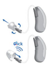 - Yeni Click Sleeve'i takarken Click Sleeve kanadının işitme cihazı üzerindeki yazılı metne doğru bakmasına dikkat edin.